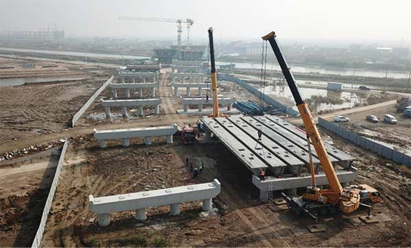 市重點工程濱響大道項目新進(jìn)展!疏港航道大橋首跨預(yù)制箱梁架設(shè)完成